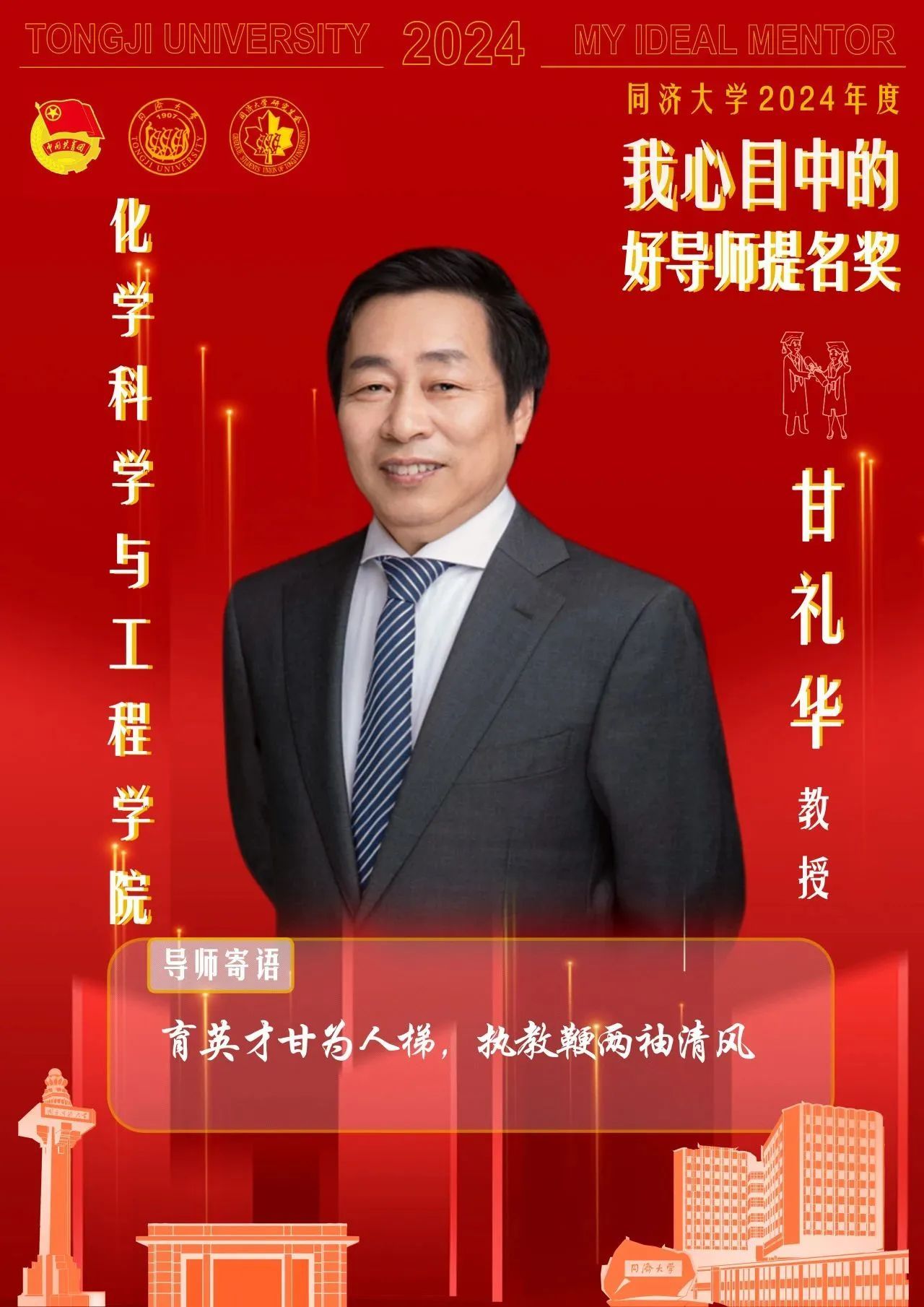 为深入学习贯彻习近平新时代中国特色社会主义思想,贯彻落实教育部《关于全面落实研究生导师立德树人职责的意见》的文件精神,大力弘扬教育家精神;为推进导生关系交汇融通,弘扬严谨求实、开拓创新的科研态度;为集中展现我校研究生导师诲人不倦、爱岗敬业的良好风尚与崇高使命,传承自强不息、严谨治学的同济精神。在永利集团研究生院、永利集团党委教师工作部、永利集团党委研究生工作部、共青团永利集团委员会的指导下,永利集团研究生会在全校范围开展了永利集团2024年度“我心目中的好导师”系列活动。经过课题组申报、学院推荐、学校决赛,甘礼华教授获得“我心目中的好导师”提名奖。