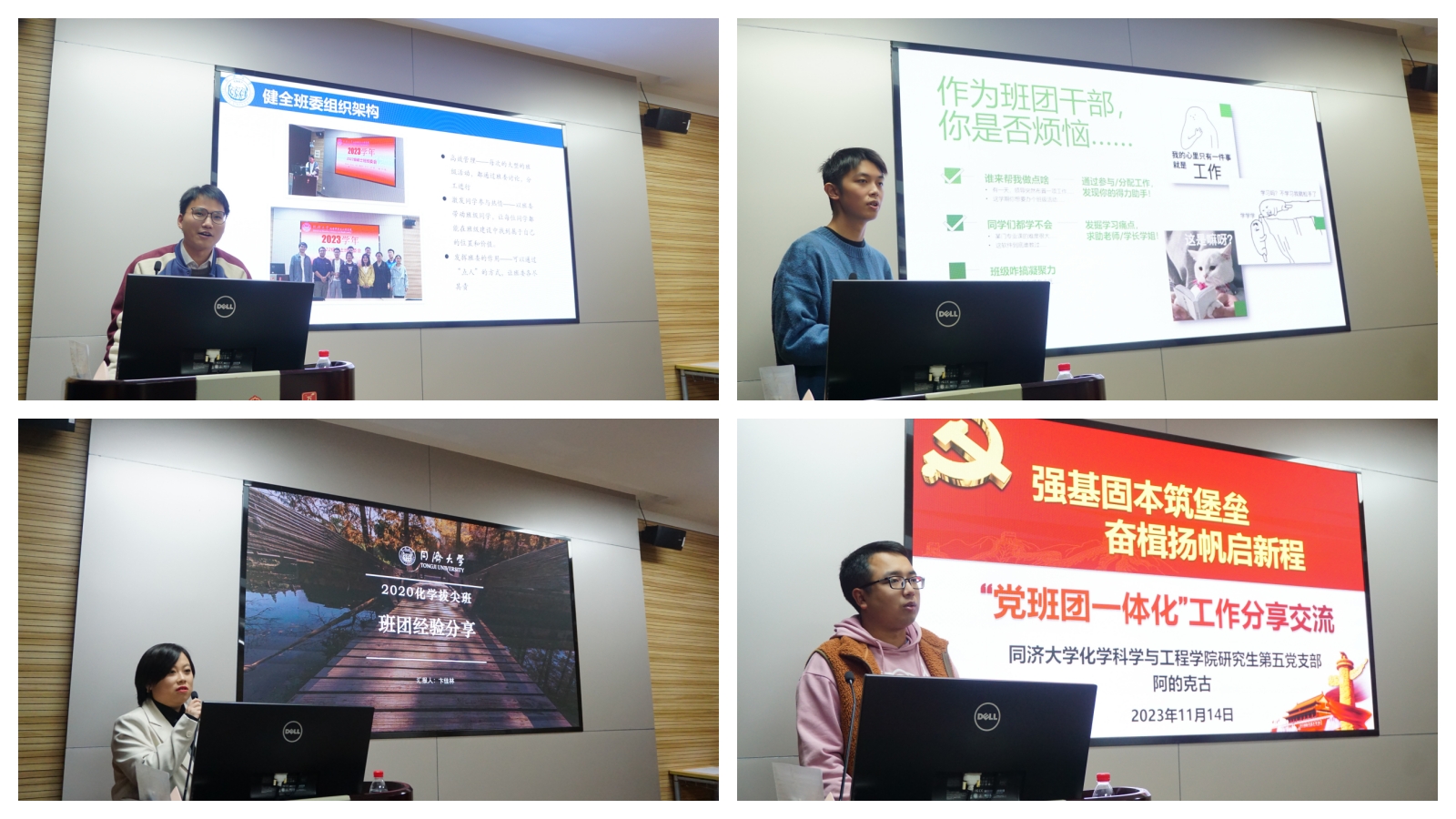 随后,四位优秀学生骨干代表分别从班级、团支部、党支部基层组织建设等角度分享了工作经验。冯伟介绍了2022级硕士班通过健全班委组织架构、提升班级成员集体活动参与感、日常积极关心关注每位同学等方式增强班级向心力,建设友好向上的班集体。2020级应化班班长唐嘉屿重点分享了如何利用学生组织助力班级建设的工作方法:动员更多同学参与校院班集体活动了解班级同学特点,积极用好学业辅导小组、优秀师长朋辈等资源帮扶学习困难同学,组织五育班级活动建设等提高班级凝聚力。卞佳琳介绍了2020级化学拔尖班积极组织班建、团建活动,发挥优秀同学引领示范作用带动整体班风学风的建设情况。研究生第五党支部书记阿的克古从党建引领、党课团课、党团支部组织活动、集中学习会议、红色课堂等方面分享了如何发挥党支部引领作用,调动学生骨干示范作用,积极推进党团班一体化建设,凝聚人心,共同进步的工作成果。