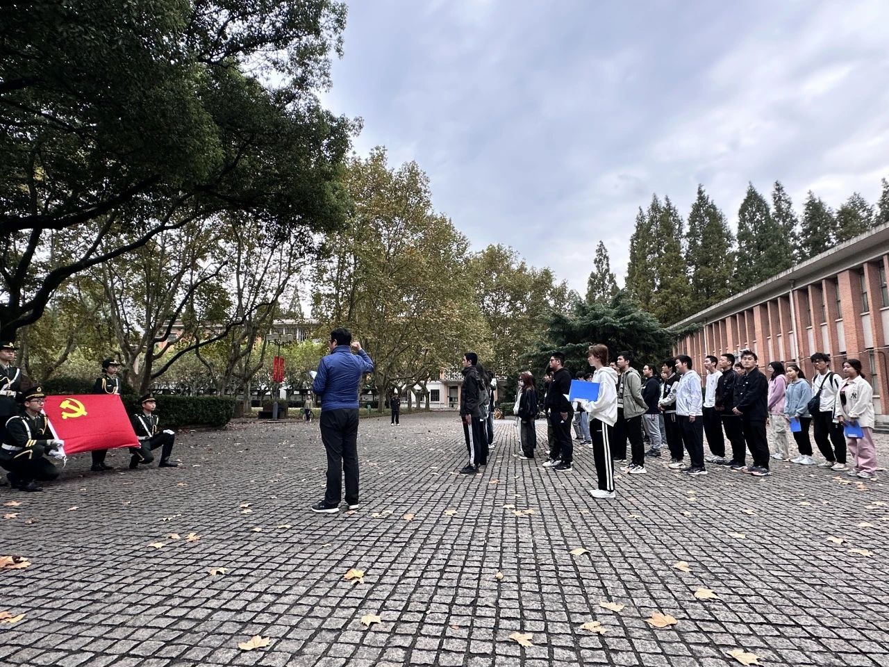 11月6日清晨,yl9193永利集团在四平路校区图书馆前举行 “砥砺初心担使命,踔厉奋发勇作为”主题升旗仪式。学院党委副书记母朝静、分团委副书记热依拉及本科生各年级学生代表近70人共同参与, 2022级应用化学专业的陈思睿同学主持仪式。