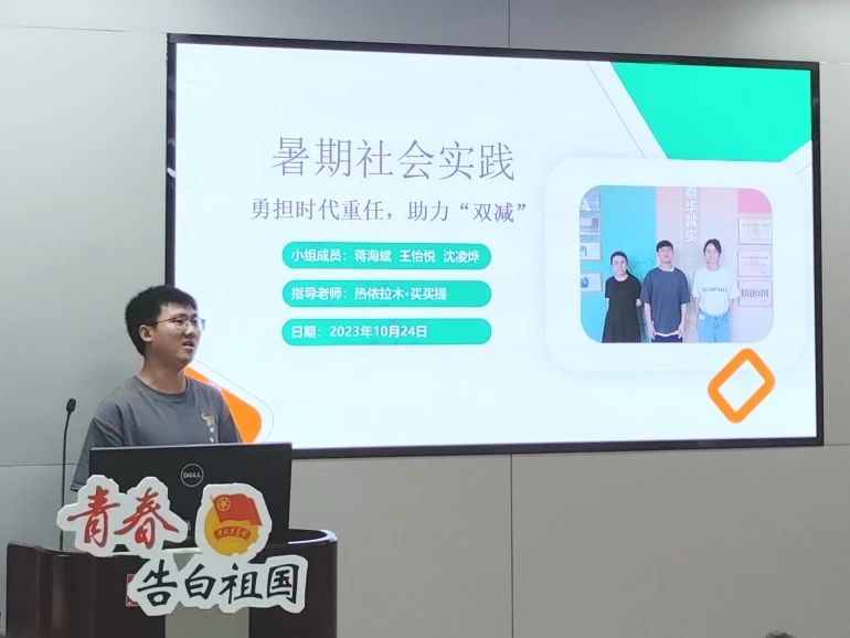 在“勇担时代重任”专题,来自化学院的蒋海斌同学分享其团队开展的社会实践项目。该团队项目聚焦教育领域中的“双减”政策,以南浔实验小学为实践地点,开展不同学科的趣味课程,关注学生的课余生活,为他们送关怀、办实事。在促进学生全面发展、健康成长等方面贡献了自己的一份力量。该项目于去年暑假开展,是去年优秀项目代表。