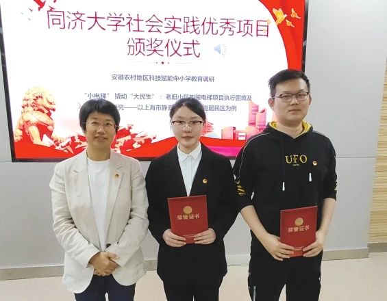 项目分享结束后,主持人宣布了2023年度“优秀项目”,分别是物理学院的“小电梯’撬动‘大民生’:老旧小区加装电梯项目执行困境及对策研究——以上海市静安区临汾路街道居民区为例”项目和化学院的“安徽农村地区科技赋能中小学教育调研”项目。殷娣娣老师为他们颁奖。