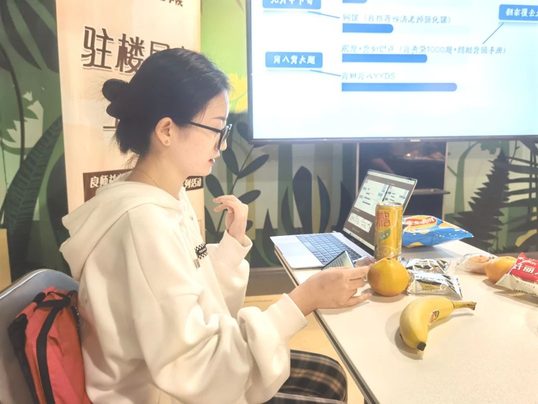 参与本次活动的同学中,不乏有意向考研的同学。针对此类需求,本次活动邀请来自研二的张进茂同学分享了自己的考研经历。她首先逐个介绍了自己在四门课程中的复习方法;其次强调心态的重要性,要静心、坚持、放松;最后她对所有同学送出了祝福:“愿你披荆斩棘,归来仍是少年”,“努力提升自己,相信未来的自己会感谢现在多坚持一会的你”。