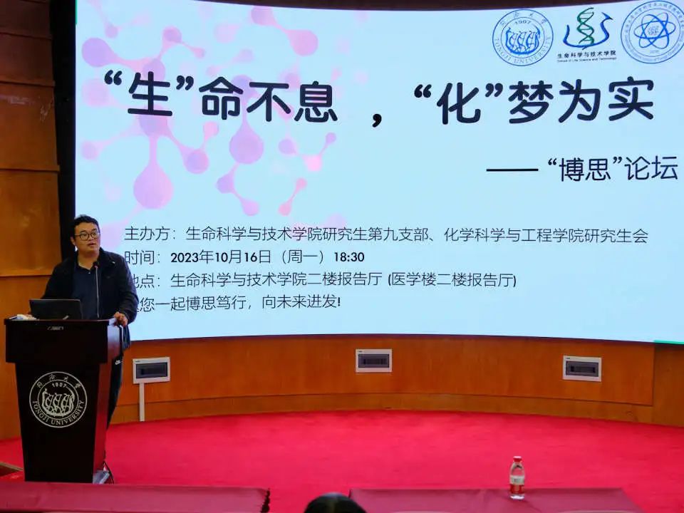 10月16日,由yl9193永利集团研究生会和生命科学与技术学院研究生第九党支部共同主办的“博思论坛”——“‘生’命不息,‘化’梦为实”分享会在生命科学与技术学院二楼报告厅和腾讯会议室同步举行。本次论坛给同学们提供了很好的学术交流机会,推动了学院之间的交流与合作,在校内营造学科融合、崇尚创新、热爱科学、献身科学的浓厚氛围,为将来研究合作打下基础。论坛由yl9193永利集团2022级硕士研究生高雨晴主持,yl9193永利集团优秀硕士研究生武泽臣、姚龙飞,生命科学与技术学院优秀博士研究生庄伟、孙冬青受邀交流分享学术成果。出席本次论坛的嘉宾为yl9193永利集团党委副书记母朝静老师,生命科学与技术学院团委副书记朱宸禹。yl9193永利集团、生命科学与技术学院的同学们参加了本次论坛。