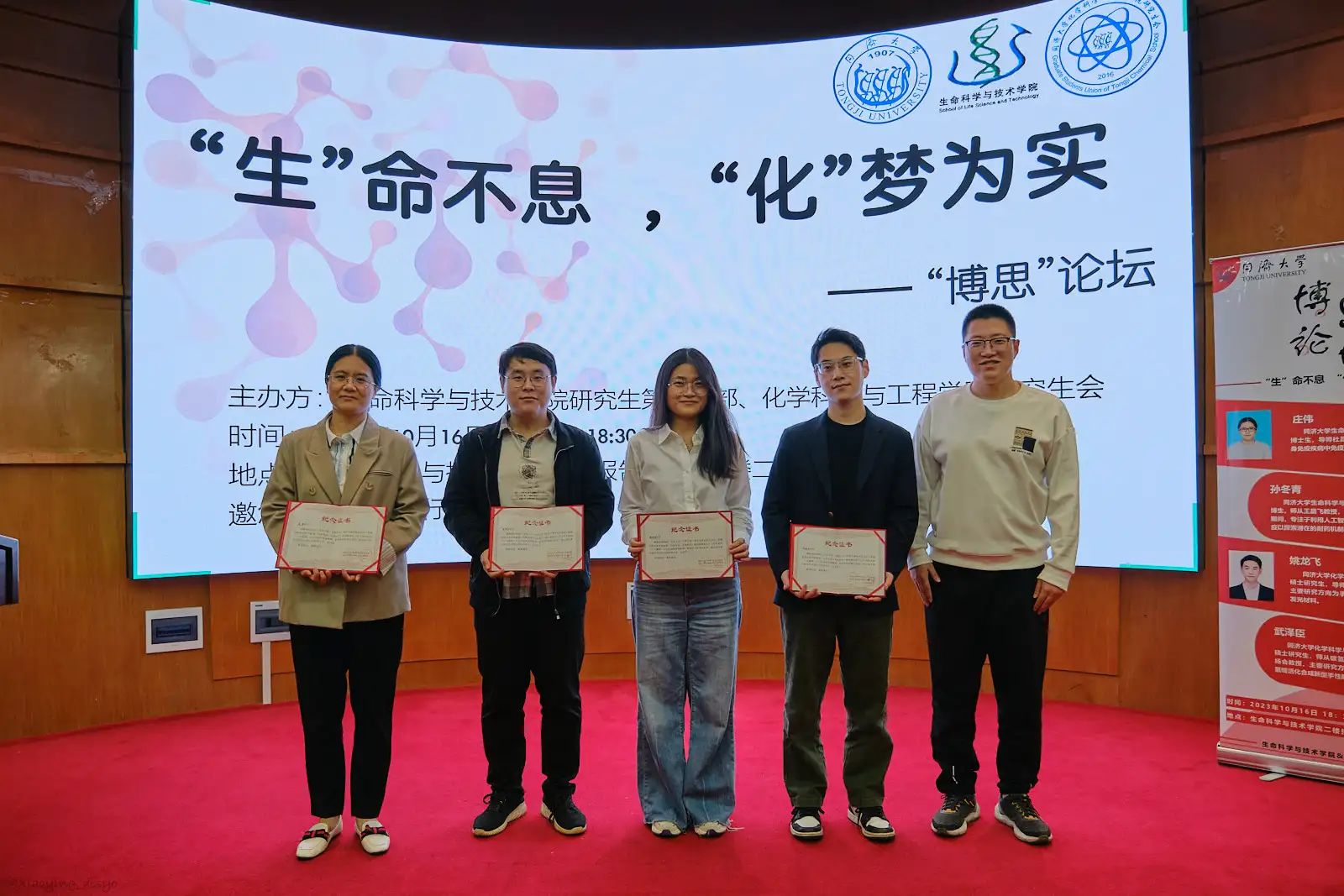 朱宸禹老师为分享者颁发了证书和纪念品。科研并不是闭门造车,而是需要不断的沟通交流,以此开拓自己的眼界。希望本次的“博思论坛”能为大家提供更多的思路,进而推动化学与生命科学之间的跨学科合作。愿大家可以带着学长学姐们的宝贵经验,在科研路上“吹尽狂沙始到金”!