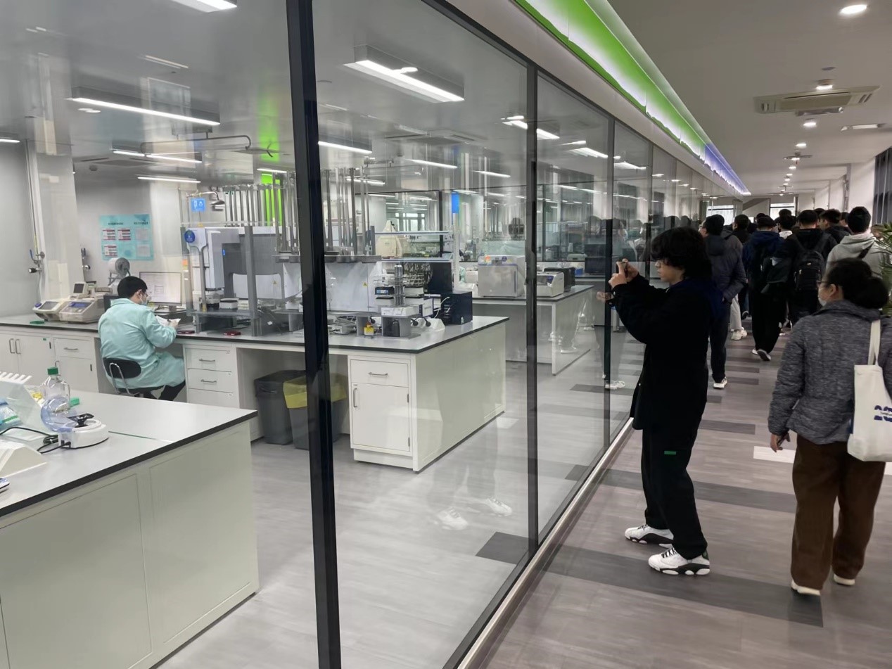 抵达药明康德众创空间后,同学们首先在工作人员的带领下先后参观了序祯达生物科技基因测序实验室和药明康德基因编码库实验室。期间,相关实验室工作人员为同学们介绍了实验室运行情况和部分仪器设备功能作用,现场回答了部分同学的提问。
