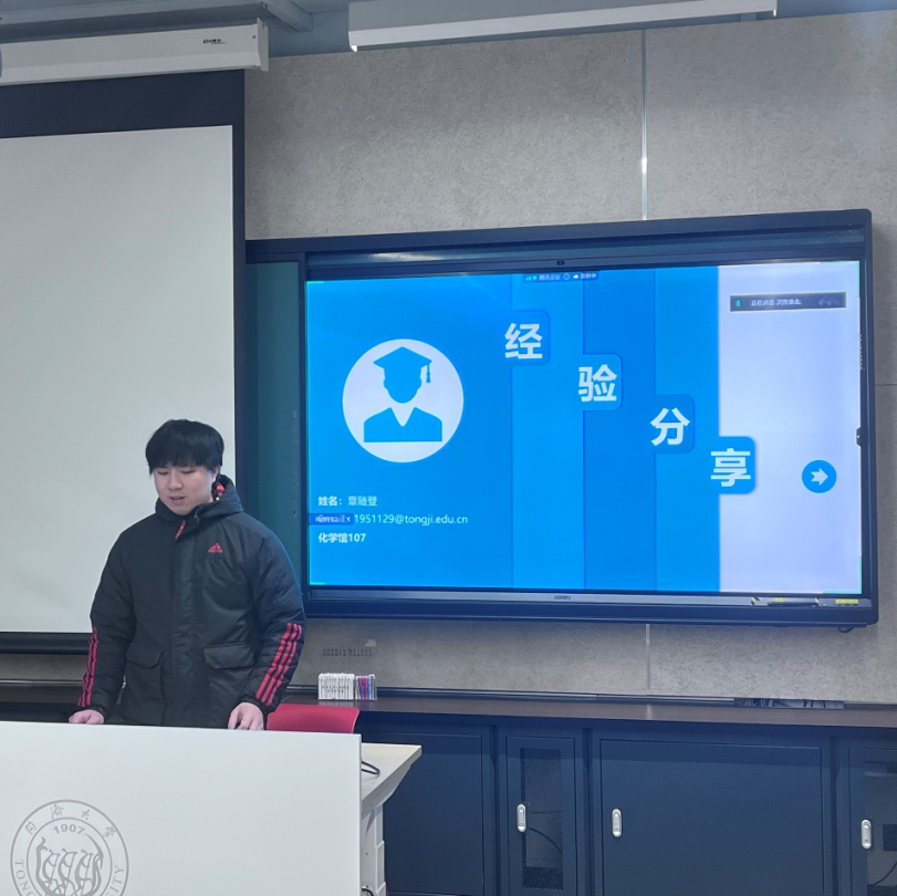 2019级化拔班的覃随登分享了作为本科生如何参与科创活动,发表科技论文的相关经验。他从科研经历、入门途径以及机遇挑战三个方面介绍了他对于发表论文的一些经验。他认为一个好的平台能够给予大家更多的帮助。正是因为有了学校、学院提供的拔尖班(化学)这样一个平台,同时加入了田志新老师课题组,得到老师的指导以及平时课题组里师兄师姐的帮助,他才能够取得今天的这些成就。