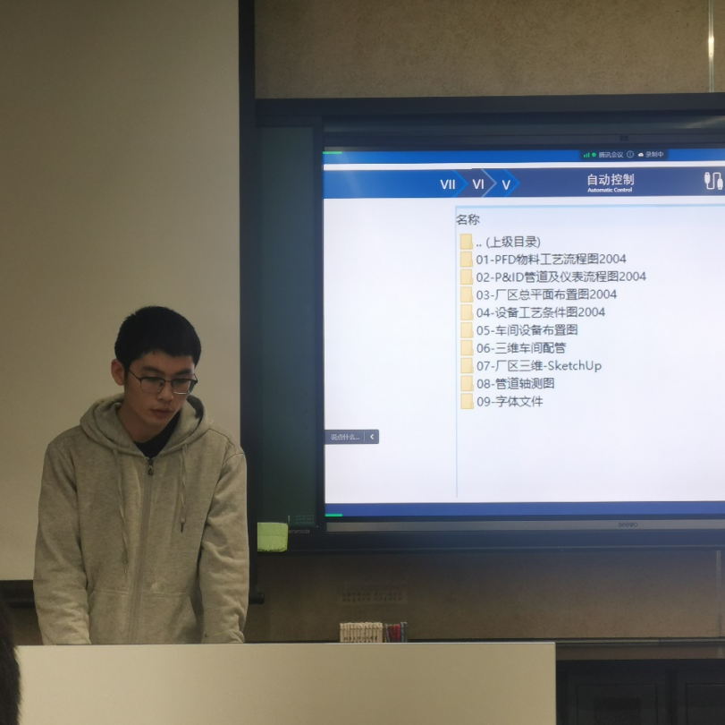 刘泳龙、刘文博和辛振华从不同角度分享了参加科创竞赛的经历和经验,三位同学组队参加了上一届的化工设计竞赛,获得了上海市赛三等奖、华东赛区一等奖以及全国二等奖的成绩。作为队长,刘泳龙负责项目的统筹及流程模拟工作,他对赛事官网进行了介绍,提醒大家注意各种通知,在时间节点之前完成各项工作。他分享了流程模拟部分应该注意的要点,并且在最后提出了答辩时应该做到的“联系”、“自信”以及“自洽”三个要点。刘文博在队伍中负责文本整理工作,他对比赛过程中需要整理的文本内容进行了介绍,作为文本负责人,既要了解项目的全貌,也要统筹项目各部分内容的统筹整理。辛振华负责CAD绘图。他介绍说,这一部分对于软件掌握程度要求较高,需要负责该部分的同学事先熟悉相关软件的操作,他结合往期作品进行了讲解。