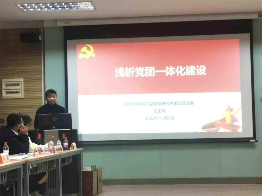学院分团委学生兼职副书记、研究生会执行主席袁广策介绍了分团委级研究生会概况、工作模式、工作思路以及具体开展案例。2021级硕士研究生第一团支部书记、研究生第四党支部书记王正明以“浅析党团一体化建设”为题,从党支部和团支部的职责使命出发,分析了党团班一体化的内涵、实操以及成效评估。
