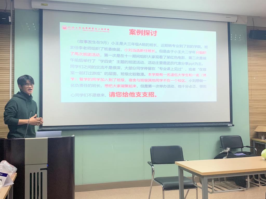 活动过程中,论坛筹备工作人员总结凝练事先收集的各班干在班级管理、建设中遇到的难题与困惑,聚焦核心问题,编写了不同情景的班级管理案例。面对案例中班干的困惑,在场同学给出了自己的看法与建议,并在讨论中逐渐完善解决方案。