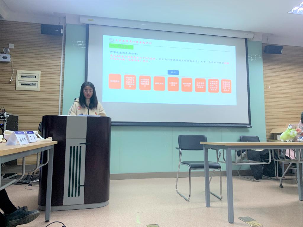 研究生心理委员代表2019级硕士一班金颖敏从大学生常见心理疾病展开,介绍了抑郁症、焦虑症和强迫症等常见疾病的常见行为与症状诊断标准以及心理问题预防和治疗手段。在基础上,她根据工作经验概括总结了心理委员的七大职责。