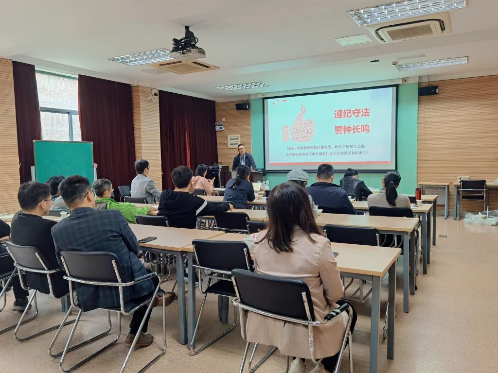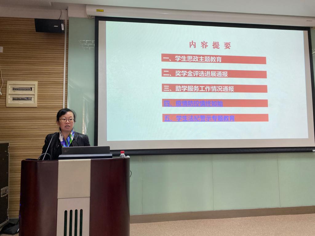 最后,学院党委副书记母朝静从两个方面进行了工作部署。第一、疫情防控慎终如始:最近多地零星出现新冠病例,在常态化疫情防控管理阶段,希望班主任通过班会等方式多提醒学生务必按照学校相关规定办理离校返校手续。第二、学生法纪警示专题教育:母老师以“以案为鉴知敬畏,防微杜渐守底线”为主题,讲解了学校相关规定,并鼓励班主任近期开展相应全覆盖的教育。