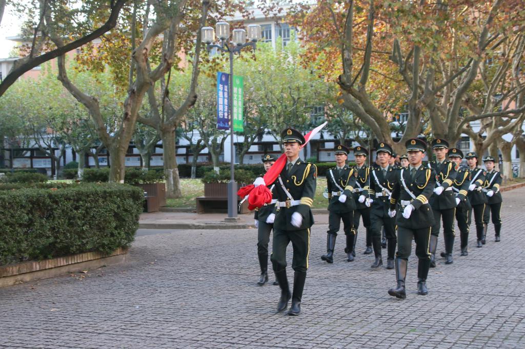 主持人王正明宣布升旗仪式正式开始,国旗护卫队的队员们迈着整齐划一的步伐,护送国旗入场,伴着嘹亮的国歌声,五星红旗冉冉升起、迎着清晨的风飘扬,全体师生怀揣着对祖国的热爱,向国旗行注目礼,脸上难掩内心的自豪感和崇敬之情。