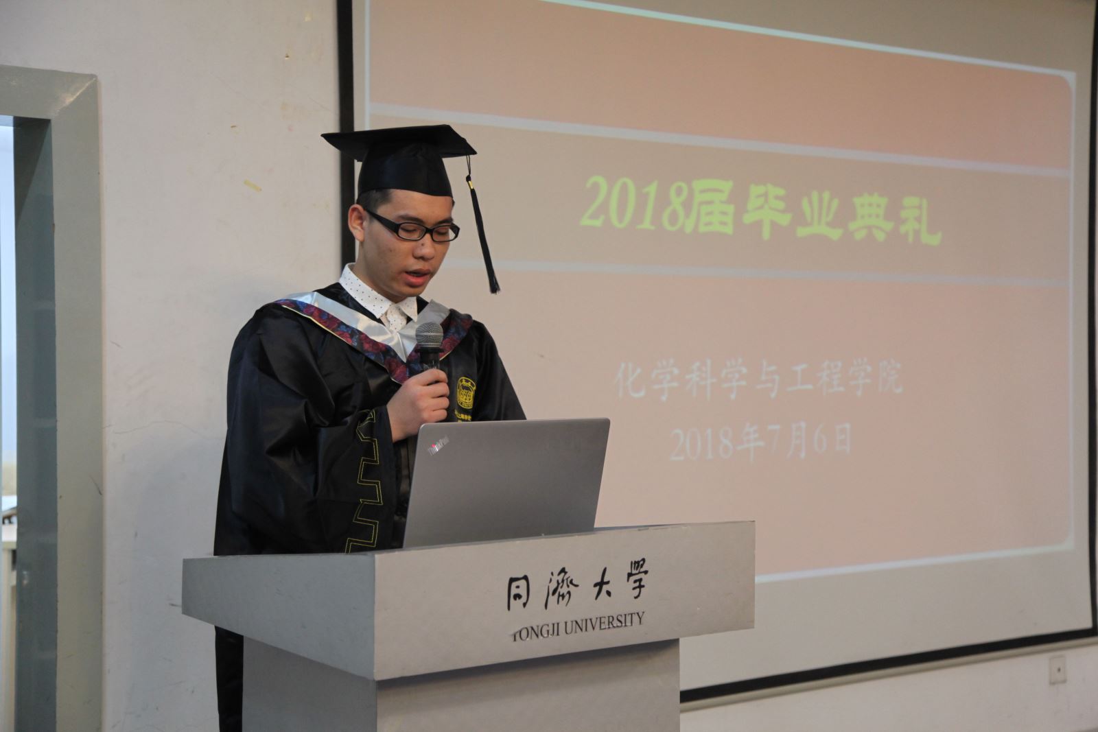 高如如同学代表全体毕业研究生发言,她说,在化学学院学习的九年时光,让她不断成长,并且见证了学院蜕变:从学院的成立,到学科排名的持续攀升,再到越来越多的科研突破,都让她十分自豪。毕业生们将永远珍藏这段意义非凡的回忆,带着化学人的骄傲,秉承匠心,砥砺前行。郑浩洋代表全体本科毕业生发表毕业感言,感谢同济和化学学院的辛勤培育,感谢老师传授知识、指明人生方向,感谢同窗好友的鼓励与陪伴,感谢父母的支持与默默付出。