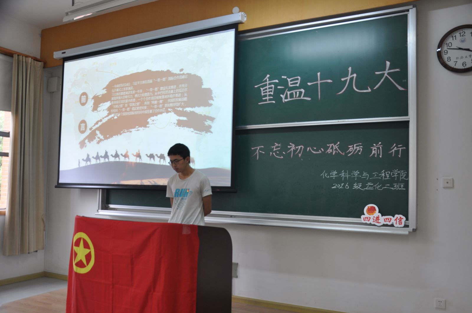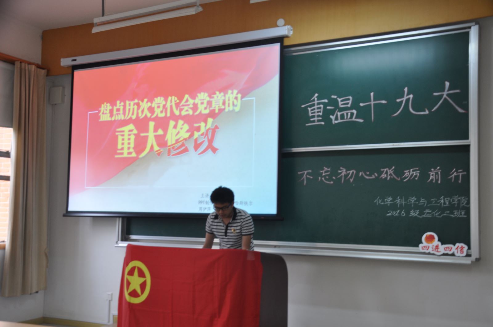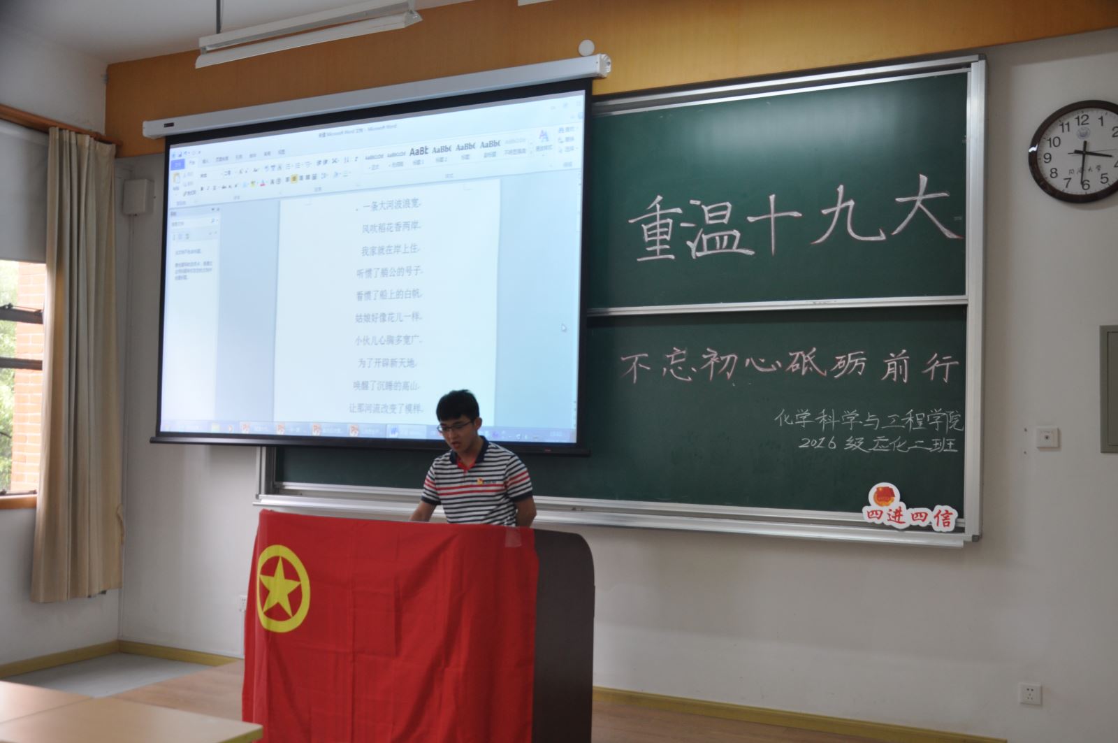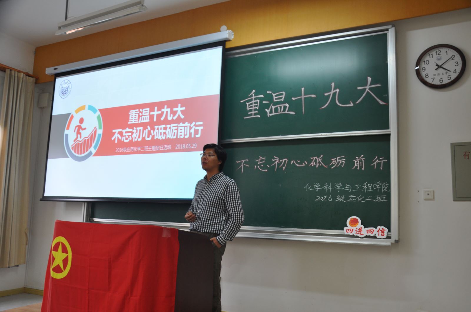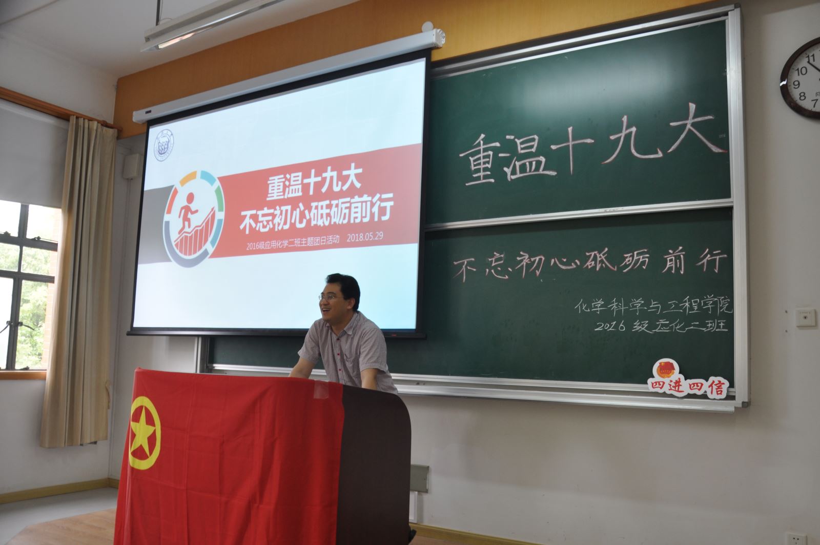 在红色五月的尾巴,yl9193永利集团2016级应化二班团支部在北楼311开展了以“重温十九大,不忘初心,砥砺前行”为主题的活动。主持人查梦欢首先引入了活动的主题以及对于十九大的自我解读,然后请学院五四青年奖章获得者刘明贤教授为我们分享了获奖的心得。