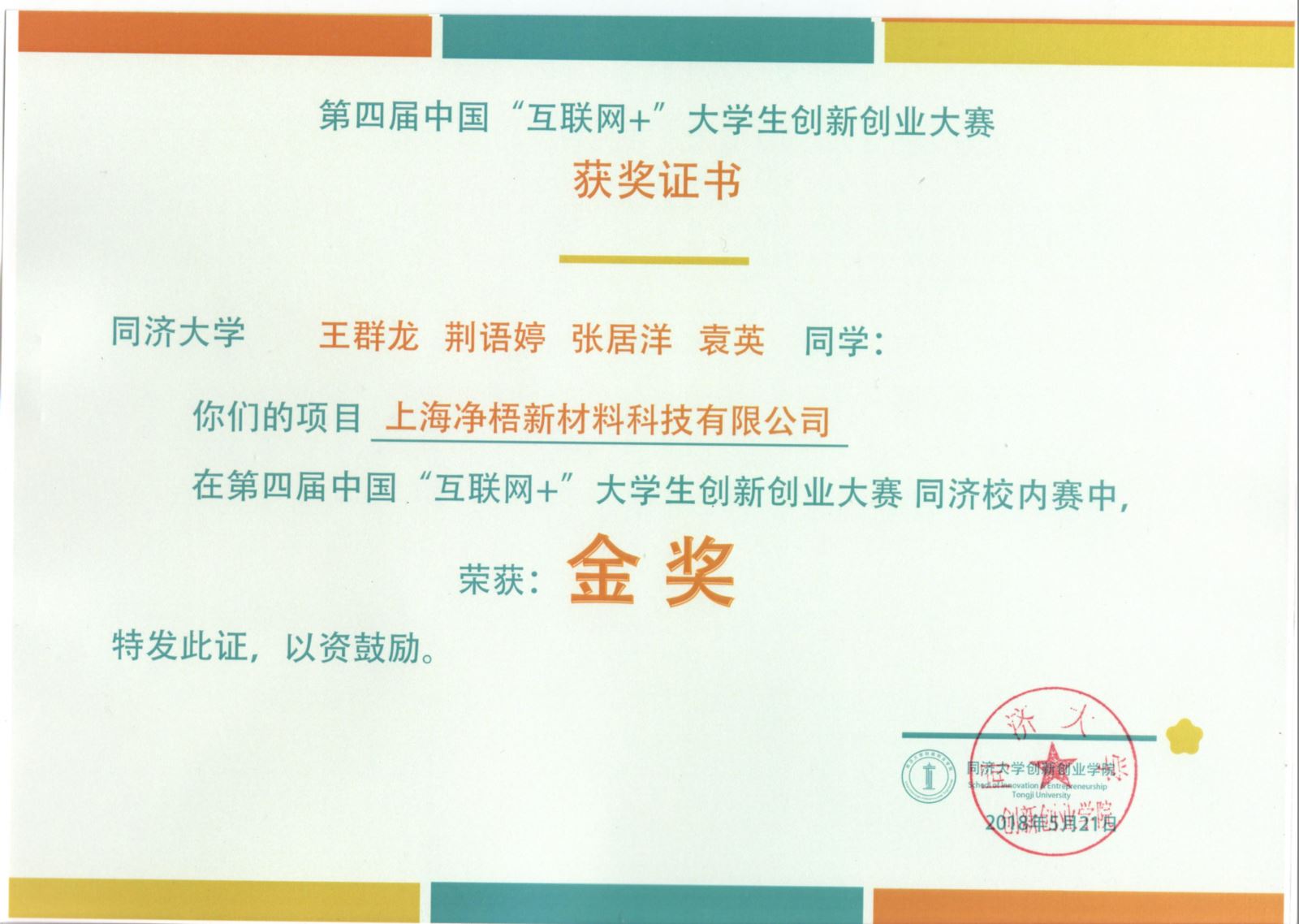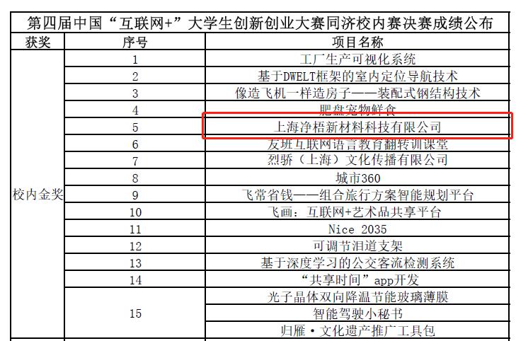 在日前结束的第四届中国“互联网+”大学生创新创业大赛永利集团校内决赛上,我院推荐的王群龙团队的项目《上海净梧新材料科技有限公司》 获得校内金奖,并被推荐将参加6月上旬举行的中国“互联网+”大学生创新创业大赛上海市复赛。
