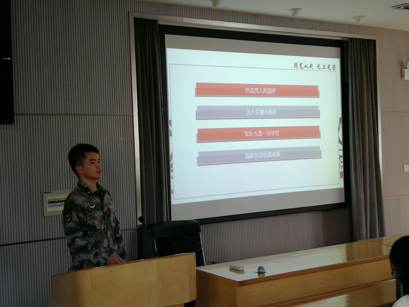 会上,袁品仕做征兵动员报告,对学校近年来征兵工作情况进行了全面介绍,着重对应征入伍同学的相关优待政策进行了解释,鼓励有志青年学生参军入伍、建功立业,同时是通过军营的历练提升自我,在未来的人生中实现自我价值。张洪源、高冲两位学长结合自己入伍的经历谈体会,与现场部分同学交流了他们感兴趣的话题。