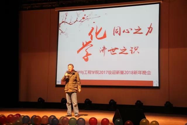 晚会19:30正式拉开帷幕,伴随着五彩闪耀的灯光,2017级硕士研究生靳俏然、仲帅为观众带来了舞蹈《Sugar》,热情洋溢的舞姿调动现场观众们的激情。主持人用饱含热情的语调讲述了精彩的开场白,同济化学人要学习贯彻好党的十九大精神,“化同心之力,学济世之识”正是化学学科践行十九大精神,共同为创建一流化学学科努力奋斗。王国强书记为晚会致辞,他总结了学院2017年各方面工作情况,对取得的卓越进步表示祝贺,并对对2018年进行展望,并向师生们提前送上了新年祝福。