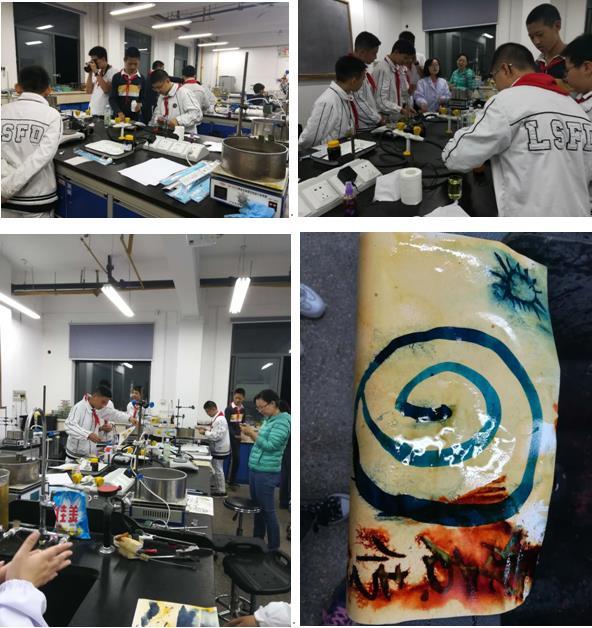 活动以《喷雾作画》为载体,巧妙地在其中安排化学实验,向兰生复旦中学的学生们展示了化学学科的独特魅力。汪晓珊同学主要负责向同学们讲解实验内容及化学原理。在讲解过程中,同学们全神贯注地听讲,并对其中的一些问题展开了激烈的讨论,现场颇为活跃。实验过程中,在我院学生党员孙成美、田清岭、杨柳、汪晓珊的帮助下,同学们用毛笔分别蘸取硫氰化钾溶液、亚铁氰化钾浓溶液、铁氰化钾浓溶液、苯酚浓溶液在白纸上绘画,并且亲自喷洒FeCl3溶液,从而完成作画。在实验过程中,面对同学们对实验现象表现出的好奇心和求知欲,老师和我院学生党员始终不厌其烦,循循善诱,引导同学们明白《喷雾作画》背后的化学原理,学习并巩固了FeCl3溶液分别遇到硫氰化钾溶液、亚铁氰化钾、铁氰化钾溶液的显色机制,并从中感受到了做实验的乐趣和化学的魅力。而这一次关乎科学与理性的启蒙,关于对真理和实践的思考,定会在他们漫长的人生道路上留下浓墨重彩的一笔。