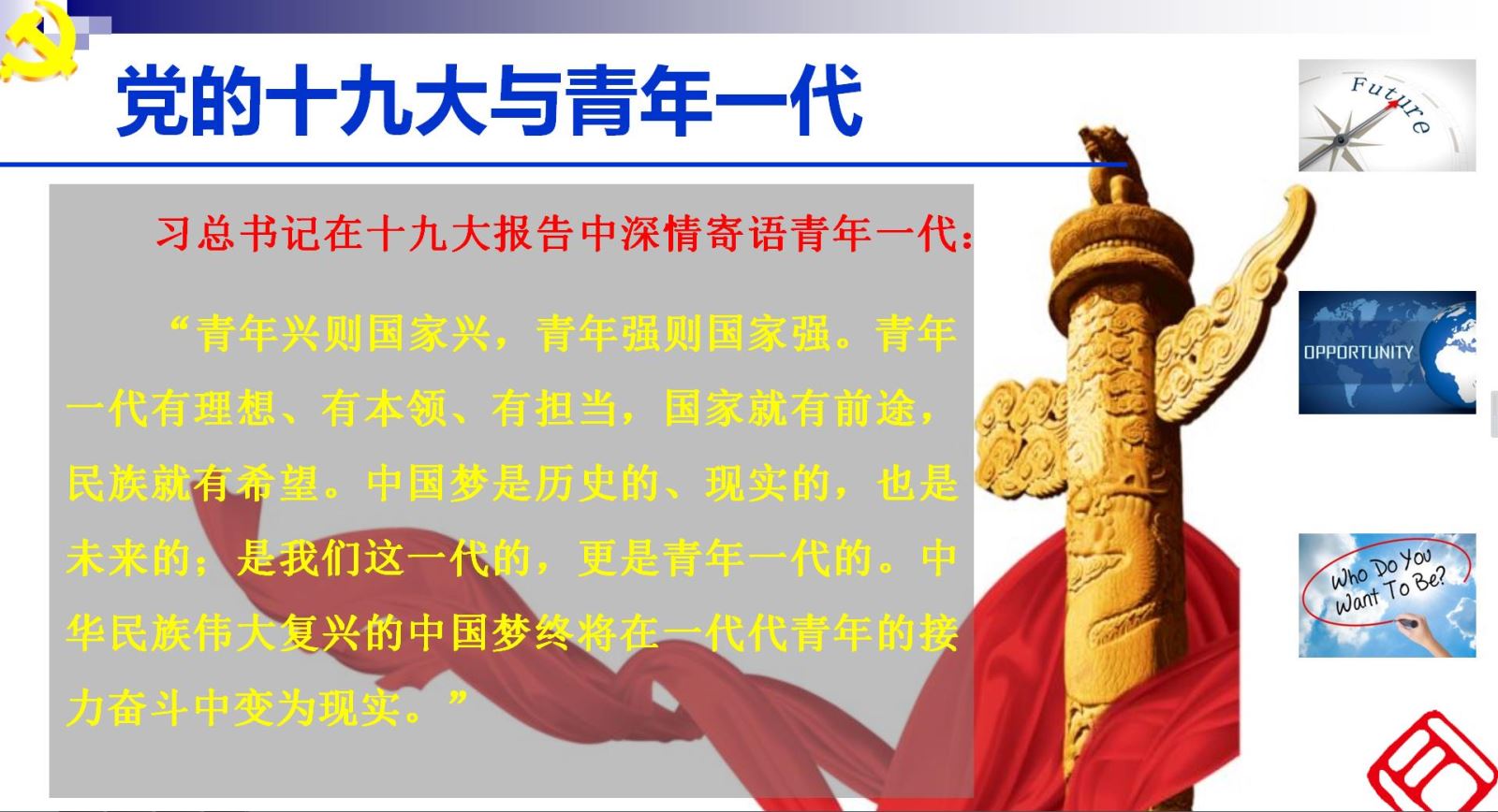 母老师首先向同学们介绍了党的十九大概况及其重大意义,特别就十九大报告中“开启全面建设社会主义现代化国家新征程”对未来直到本世纪中叶三十多年国家发展的愿景交流,指出在座的同学们人生成长发展的黄金期已经在党的十九大的愿景规划之中了,所以同学们要认真学习十九大报告,原汁原味学习报告,在报告中找到个人未来发展的定位,明确个人未来发展的选择。母老师还就自己认为十九大报告与青年一代直接相关的内容与同学们进行了分享。结合多年学生工作的经验,母老师指出了同学们本科毕业可以选择的发展方向,并就每一个选择做了简要分析。在此基础上,母老师希望同学们在立德树人的育人大背景下,坚持培养良好的习惯,注重品德修养、身心健康、能力培养、知识学习和美育涵养多方面,努力做“与国家发展和民族振兴同向同行”的事,做“紧跟时代步伐聆听时代声音回答时代课题”的事,传承同济精神,成为名副其实的同济人。他指出,同学应该努力成为践行社会主义核心价值观的先锋,希望有理想有担当的优秀青年学生应该去真正认识、深入了解中国共产党这个优秀组织,认可接受中国共产党的理念,努力成为中共党员,投身“为中国人民谋幸福,为中华民族谋复兴”的伟大事业中来。 |