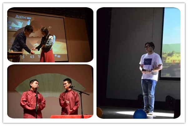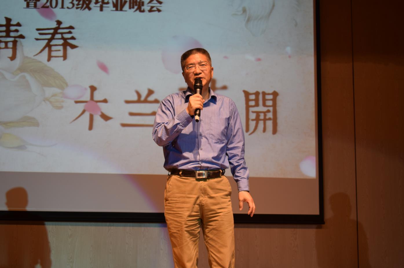 在一段段视频回忆中展开了第二篇章,展现了传道授业的老师们对同学们的谆谆教诲。本学期,学院结合师德师风主题教育实践活动开展了身边的优秀教师推选活动,资深教授朱仲良老师当选。朱老师登台再次深情的点名,湿润了众多毕业生的眼角,他代表学院老师们对毕业生表达了离别的祝福,毕业生们也用节目向老师们表达了深情的感谢,对学院的发展送上了祝愿。2013级本科毕业班杨世琪、谢文超深情演绎《兰亭序》,2014级本科生陈嘉薇挥毫书写助演,为毕业生们送上学弟学妹们的祝福;VOKA清唱团带来动听的清唱《run to you》,沁人心脾;2015级本科生刘文博带来了精彩的近景魔术表演《time traveler》;2015级本科生黄恒聪和2016级本科生武泽臣再次搭档带来诙谐幽默的相声《九点钟开始》,给晚会增添不少乐趣,也增添了青春的活力。