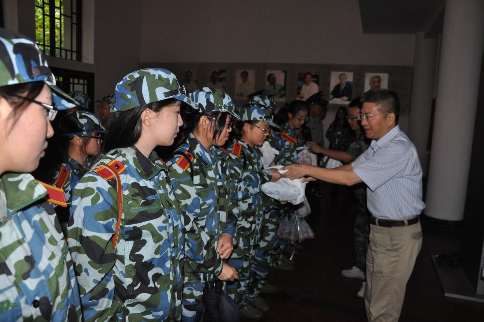 当天,恰逢雨天,军训师生在教学南楼进行室内训练,9:30参训师生在南楼大厅整队集合,王国强书记代表学院党政向参训教官和随训教师表示真诚的感谢,感谢他们在训练场上严格要求又细心照顾我院学生,让学生通过军训达到了规范纪律、提升意志品质的目的。同时,王书记祝贺参训学生通过军训取得的进步和成绩,也向同学们反馈了教官和随训教师对他们的认真参训给予的表扬。随后,王国强书记向在场的教官、随训教师和参训学生一一送上学院精心准备的慰问品。