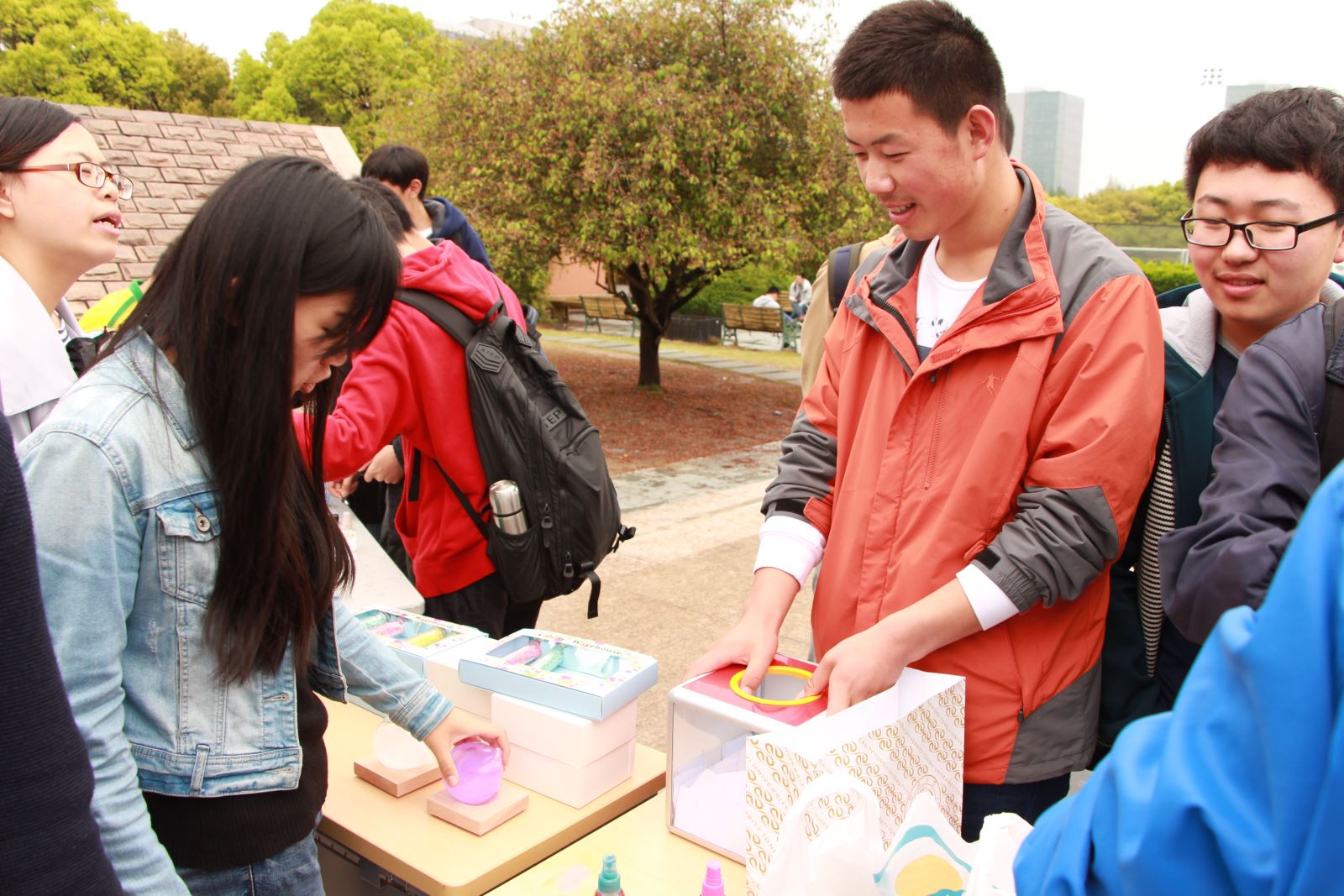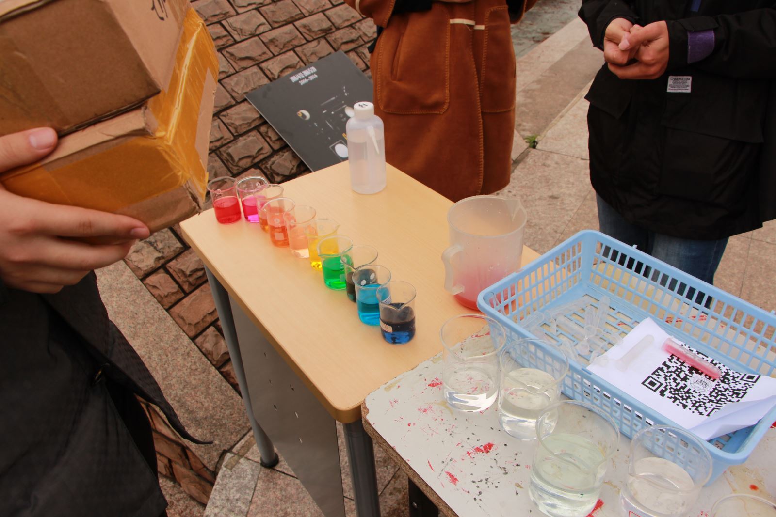 在开幕式现场,学生会成员们准备了精致的礼物、精彩的游戏和精美的义卖品,通过提前的线上线下宣传,开幕式现场聚集了许多来自全校各个院系的同学,大家纷纷对现场表现出了好奇。现场共有义卖、明信片赠送、搭球棍模型、有奖问答、参与实验等五个摊位组成,同学们在成功答题或搭球棍模型后方可获得“晶体明信片”“风暴瓶”“试管糖”等颇具化学风范的奖品。