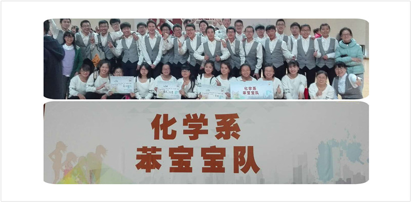 伴随着欢快的音乐,化学系“苯宝宝队”登上赛场,该队由21名男生作溶剂、13名女生为溶质,外加两位班主任催化产出。他们是这个时代的结晶,他们会用自己的舞姿证明化学系的风采!在当天的比赛中,苯宝宝队两登舞台,用精彩的舞姿展示了化学系积极向上、团结奋进的风采,勇夺第四名,获得一等奖。苯宝宝队步伐整齐、活力四射,赢得现场观众的阵阵掌声,还荣获“最具人气奖”。