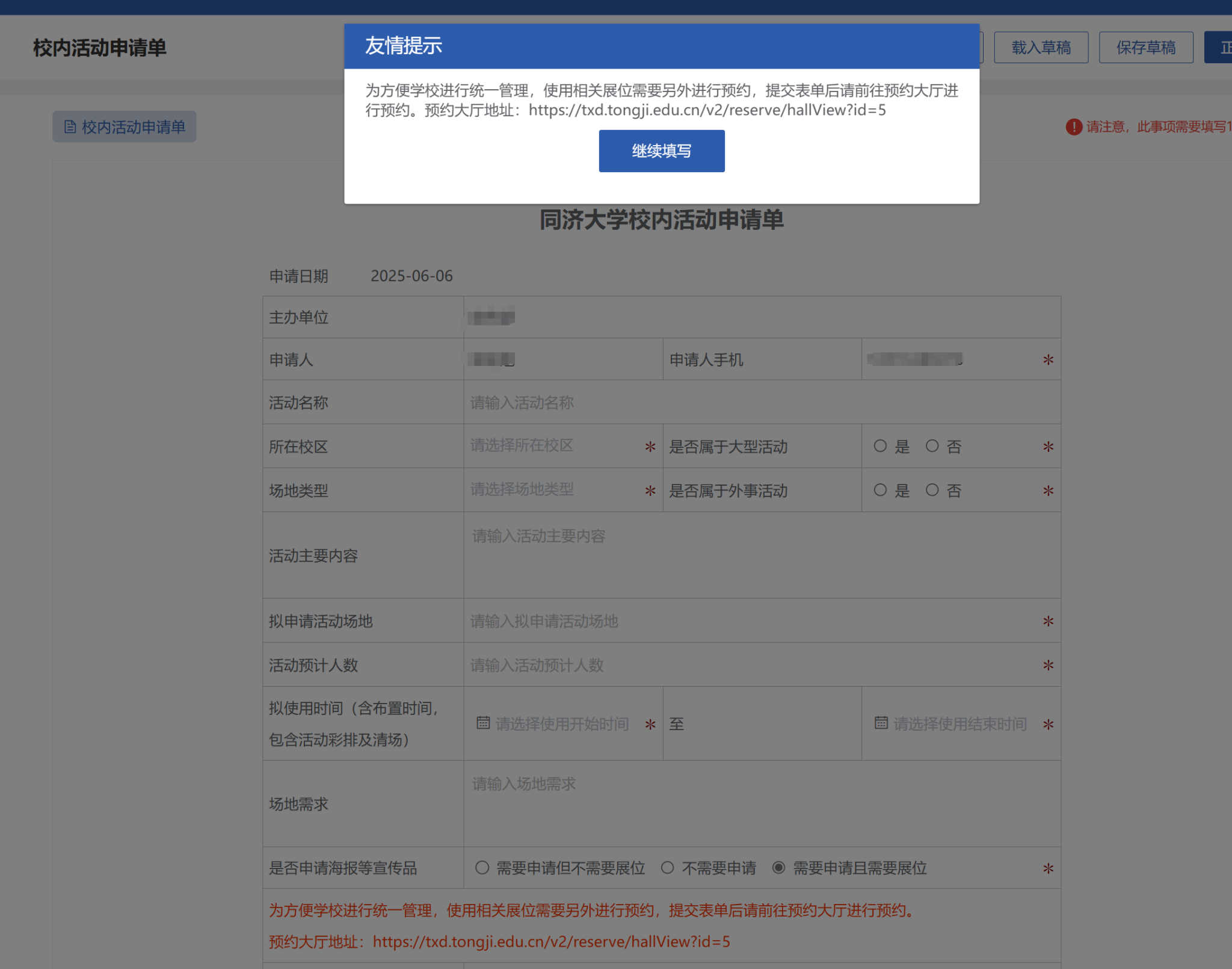一网通办链接:all.tongji.edu.cn,搜索“校内活动申请”点击在线办理