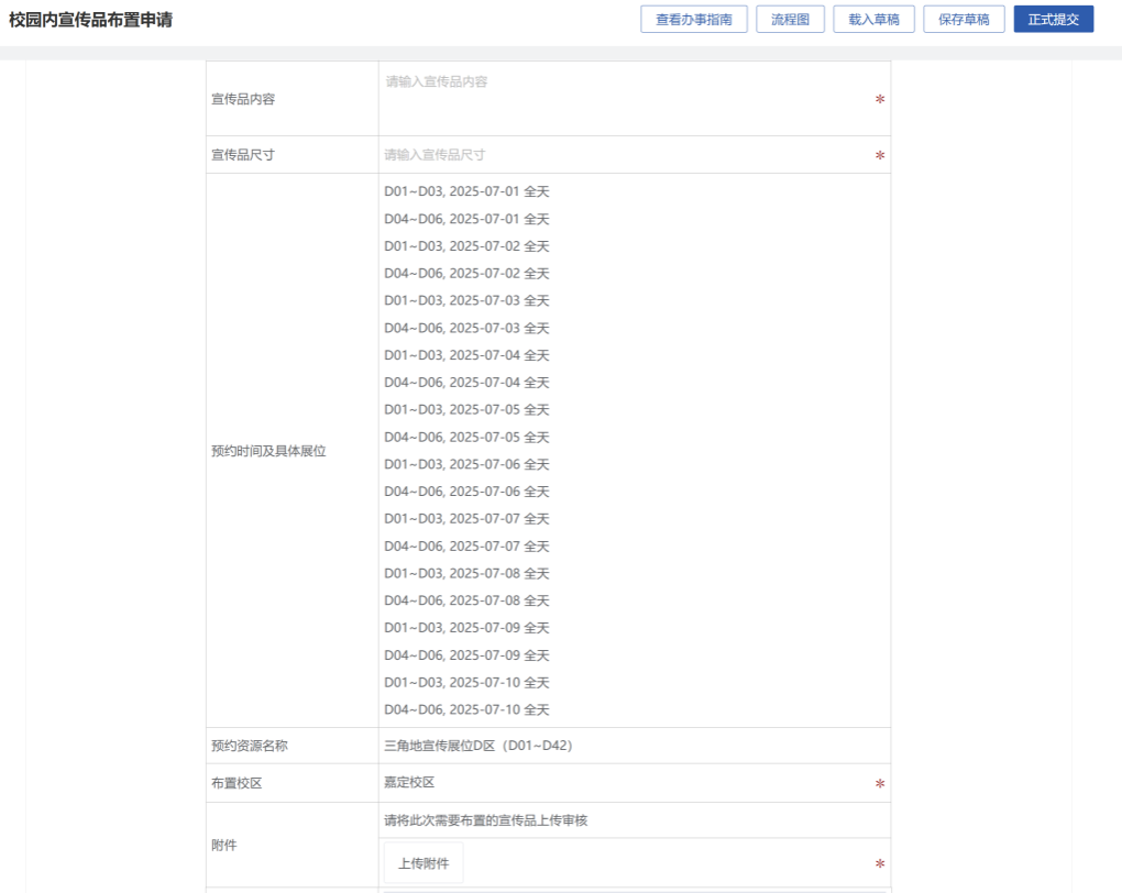 每块展位大小为A0尺寸,以预约7月1日至10日的D01-D06,6块展位为例,可在批量选择中选定块数及使用时间,确认后预约后进入表单填写,预约时间及摊位会自动同步到表单中,按要求填写其他内容并确认无误后可提交审批。具体预约审核结果以流转至宣传部审批后为准。由于展位数量有限,建议合理化安排申请,如不使用请及时取消申请释放资源。