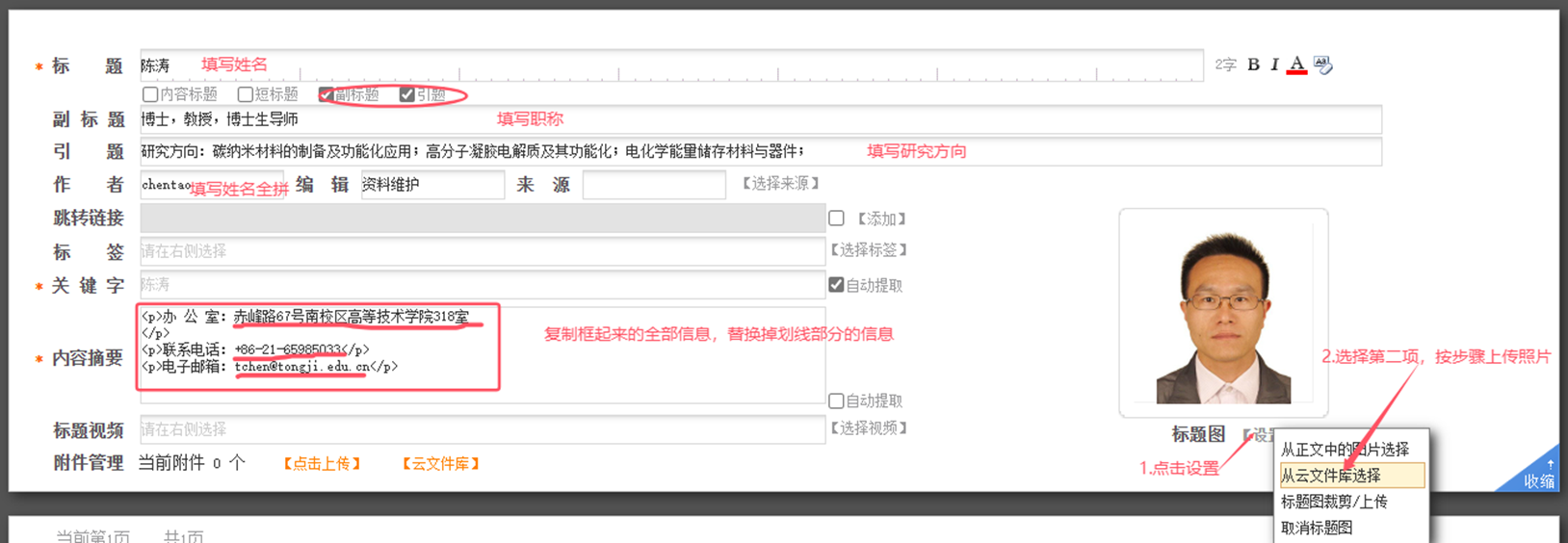 3. 如果需要更换照片,可按如下步骤上传标题图(尺寸:200*266)。