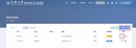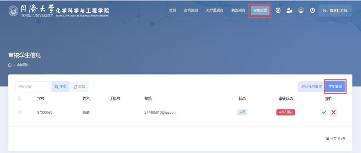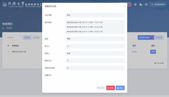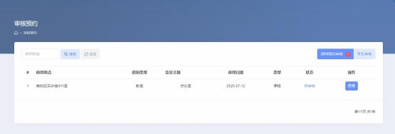 点击后查看学生的预约信息,审核通过后预约时间段将被锁定,由学院管理员审 核通过后即可使用