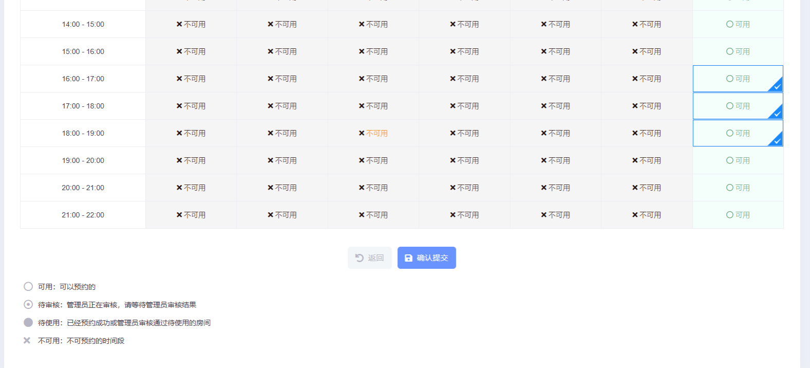 注:学生提交后显示待审核,该时间段还是可以被其它学生预约,谁的导师审核时间在前,房间就被谁预约占用,界面会显示有其他人待审核。