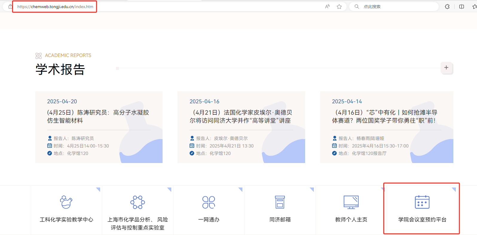 预约登录地址:https://chemmeeting.tongji.edu.cn/;或在学院官网首页相关链接登录使用。
