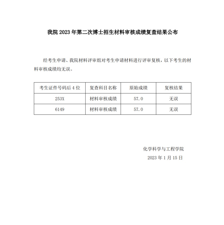 我院2023年第二次博士招生材料审核成绩复查结果公布